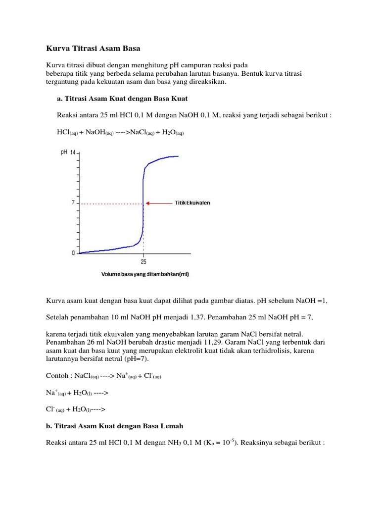 Inilah kurva titrasi yang dihasilkan ketika asam kuat dititrasi dengan basa lemah: Titrasi hcl dengan larutan naoh 0,1 m diperoleh berdasarkan tabel berikut. Lewis mengemukakan teori asam basa yang lebih luas dibanding kedua teori sebelumnya dengan menekankan pada pasangan elektron yang berkaitan dengan struktur dan ikatan.menurut definisi asam basa lewis : Titrasi basa lemah oleh asam kuat. M b = (n a x m a x v a )/ (n b x v b) m b = 1 x 0,1 x 20)/ (1 x 40) m b = 0,05 m.