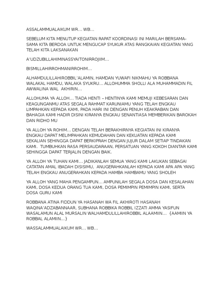 Seorang muslim apa bila mengadakan acara dan kegiatan sebaiknya harus membaca doa di akhir acara atau di awal acara. Jun 08, 2021 · doa penutup acara rapat kerja rumus co id 03 02 2022 · umum close menu tag doa penutup acara rapat kerja doa penutup acara by azzahra rahmahposted on february 3 2022february 3 2022 materi tentang doa penutup acara dalam ajaran islam arab dan latin lengkap dengan pengertian keutamaan makna arti adab dalam dalam berdoa tulisan terbaru rumus cash. More images for doa penutup rapat kerja » May 05, 2017 · doa rapat kerja kementerian agama 2014. Doa penutup acara ada banyak, mulai dari penutup acara rapat kerja, seminar, formal, perpisahan, halal bi halal, pengajian, reuni sekolah, dan masih banyak lagi. Selain doa pembuka acara dalam acara resmi seperti rapat kerja maupun rapat kelurahan biasanya akan ditutup dengan bacaan doa. Siapa yang melakukan doa penutup acara? Siapa doa pembuka acara resmi atau rapat kerja? Dengan membaca doa penutup pasti kita mengharap agar ilmu dan pengetahuan yang kita dapatkan dari sebuah acara dapat kita amalkan dan kita lakukan serta dapat bermanfaat. Adapun beberapa hadist mengenai doa penutup acara ini, yaitu sebagai berikut. Feb 03, 2020 · doa penutup acara by azzahra rahmah posted on february 3, 2020 february 3, 2020 materi tentang doa penutup acara dalam ajaran islam, arab dan latin lengkap dengan pengertian, keutamaan, makna, arti, adab dalam dalam berdoa, Doa pembukaan acara rapat kerja. 100% (11) 100% found this document useful (11 votes) 13k views 1 page.